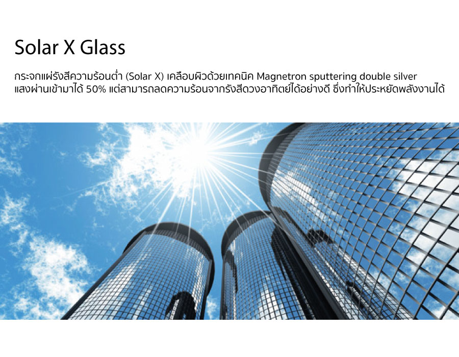 กระจกแผ่รังสีความร้อนต่ำ (Solar X) เคลือบผิวด้วยเทคนิค Magnetron sputtering double silver แสงผ่านเข้ามาได้ 50% แต่สามารถลดความร้อนจากรังสีดวงอาทิตย์ได้อย่างดี ซึ่งทำให้ประหยัดพลังงานได้ อีกทั้งยังมีค่าการสะท้อนแสงต่ำ เป็นอีกทางเลือกหนึ่งสำหรับอาคารบ้านพักอาศัยที่ต้องการประหยัดพลังงาน ควบคุมอุณหภูมิหรือลดความร้อนที่จะเข้ามาภายในตัวอาคาร