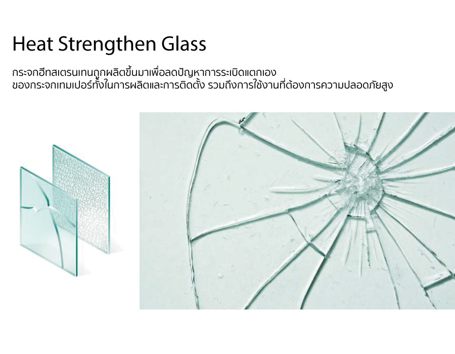 - กระจกนิรภัยฮีตสเตรนเทนไม่สามารถตัด เจาะรู บากมุมหรือเจียรขอบได้ ภายหลังการผลิต