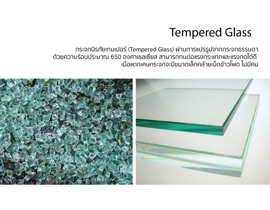 - กระจกนิรภัยเทมเปอร์ ไม่สามารถตัด เจาะรู บากมุมหรือเจียรขอบได้ ภายหลังการผลิต